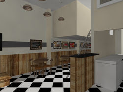 Iniciamos toda a mudança a partir do nome. O espaço adotou o nome do criador como elemento principal, com suas devidas assinaturas: ABINADER Boteco & Bebidas. A partir daí partimos para a organização interna, desde o espaço de estoque, mostruário de produtos, até a construção de um lavabo e dois banheiros para atendimento ao público. Área de fluxo de cozinha e melhorias na fachada também foram feitas. E o maior destaque, a criação do espaço do boteco, com linguagem clássica, piso xadrez e artifícios de baixo custo, como revestimento em adesivo, luminárias industriais e tons neutros para destacar os elementos decorativos de fornecedores parceiros.